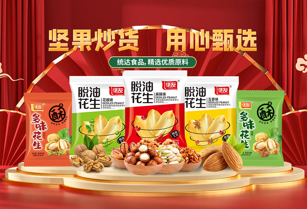 洛陽市統達食品有限公司創建于2013年,坐落于風景秀麗的嵩山腳下,東依省會鄭州、隴海、焦枝兩大鐵路在此交匯,西連高速,洛界高速,縱橫東西南北,207國道,交通便利。當地環境優美。經濟繁榮昌盛,實為興業辦企,鴻運福順的好地方。少林寺,白馬寺,龍門石窟,玄奘故里等名勝古跡星羅棋布,近在咫尺,盡展千年華夏文明。  我廠是一家集生產,研制,銷售為一體的食品加工企業,總投資1500萬元,廠房占地面積5000平方米,員工100余人,其中技術人員20余人,年加工能力達1500余噸。公司以堅果炒貨為主導,自主三大品牌:統達牌、紅仁館牌、佬友牌和授權品牌速達,主要產品有酒鬼花生系列,麻辣花生系列,香辣酥系列,果仁裹粉類系列,怪味胡豆系列,蠶豆、青豆系列等多個品類。產品暢銷全國各地,深受用戶好評。產品選自上等原料經多次精選而制,秉承濃郁的特色風味,保留其原材料的營養和原汁原味,富含不飽和脂肪酸和人體必需的氨基酸和鋅元素,不含膽固醇,黃曲霉素,不添加防腐劑、著色劑;具有濃郁獨特的香味,是真正的“從土地到餐桌”的健康食品。產品特點:色澤金黃,顆粒飽滿,然后經多種工藝加精良的天然配料精制而成,鎖生產出來的產品既保持著產品的獨到的口味,又不失產品天然的營養成分,滋味純正,辣椒鮮紅食之麻,辣,香,酥,甜,口感獨特,食后滿口生香,欲罷不能。久食不厭,老少皆宜,居家旅游,佐食配茶,宴賓饋友之佳品,深受廣大顧客歡迎和贊揚。  我們將以精湛的工藝,科學的管理,嚴格的質量控制,優異的品質保障,以誠信,創新,勤奮,求實的企業精神,立于強者之林,迎接新的挑戰。以飽滿的熱情迎接與你的合作。  本公司“以質量求生存,以誠信求發展”歡迎有志之士加入我們的團隊,攜手共創美好明天!